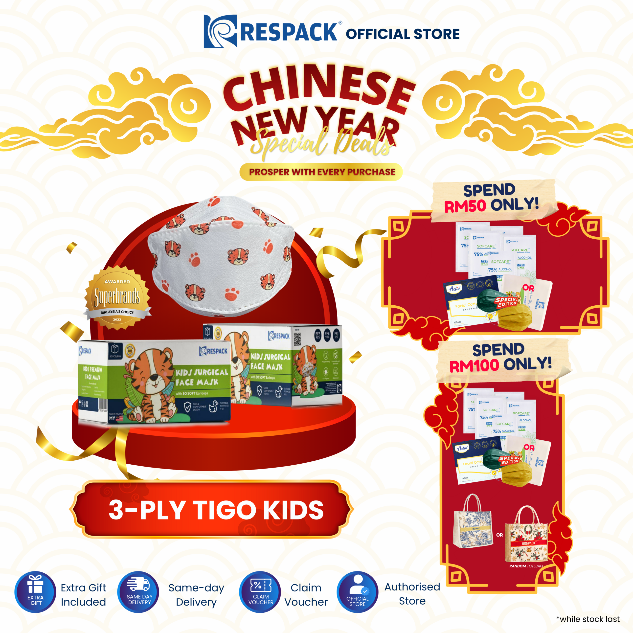 Home Face Mask [FREE ADULT TIGO] Respack Kids 3-Ply Surgical Face Mask (Tigo) | 50 pcs Earloop